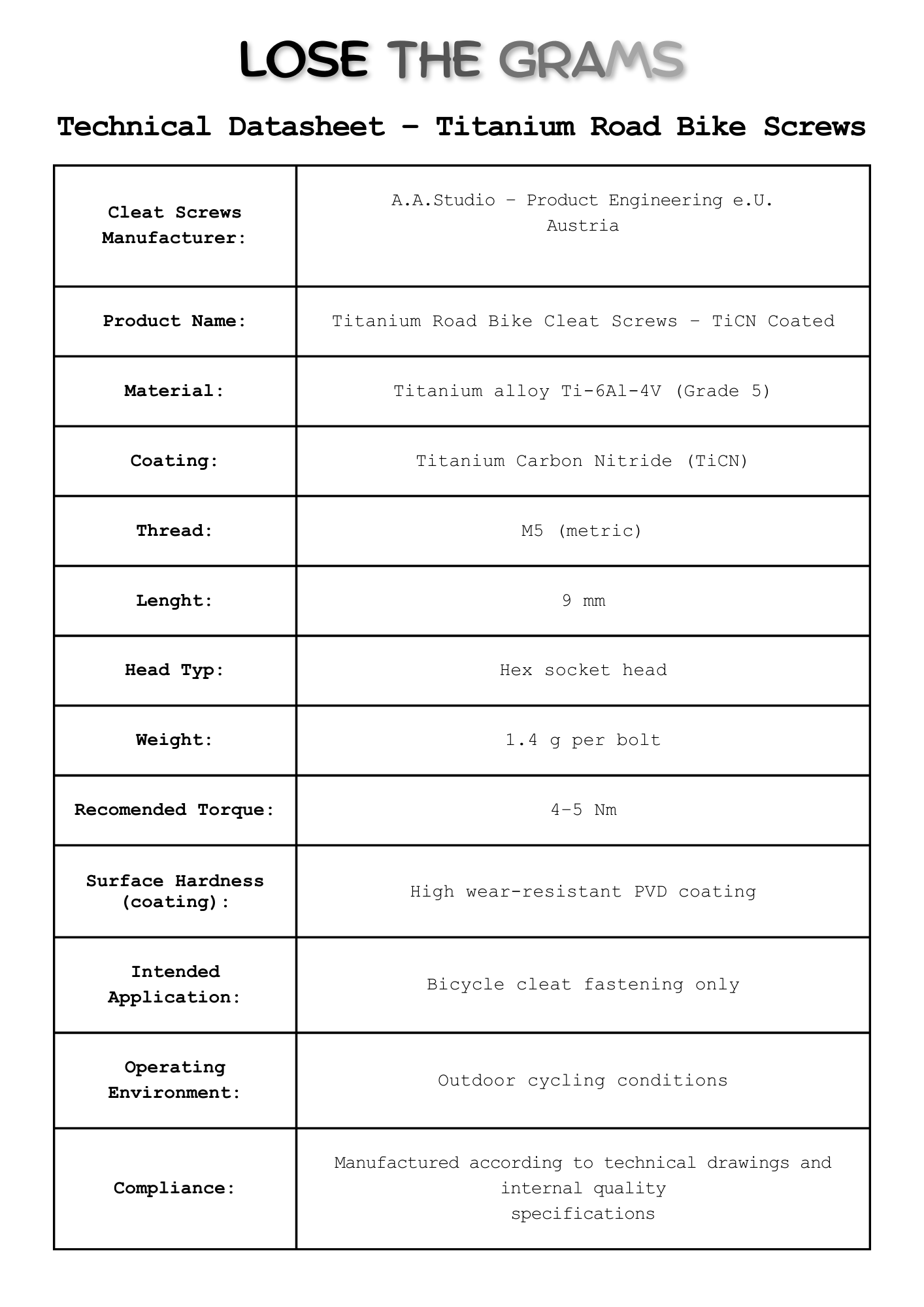 Optimized titanium screws developed to reduce weight in clipless cleat systems.